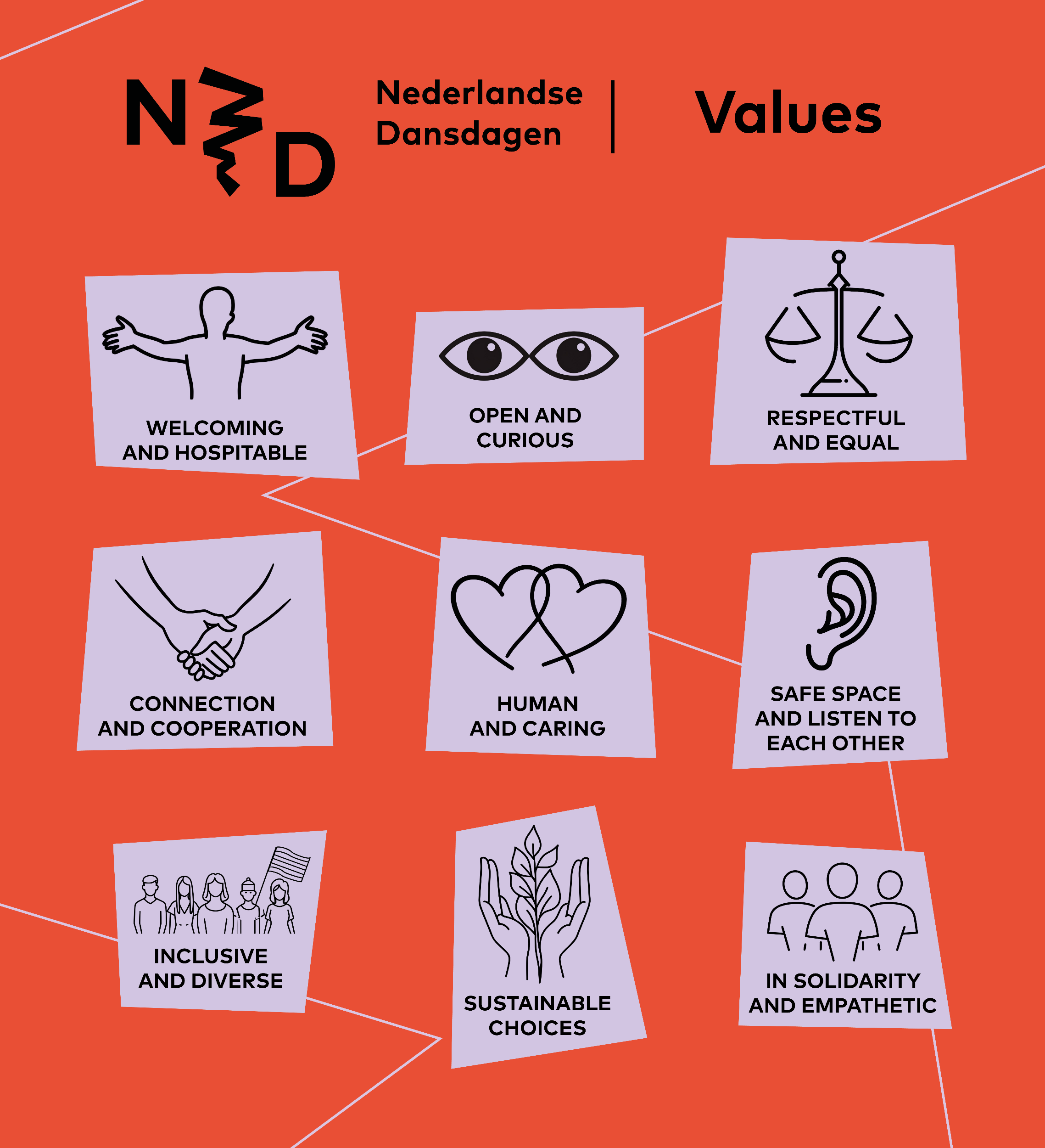 At Nederlandse Dansdagen we want to create a safe, inclusive, and inspiring environment – for our team, artists, partners, and audience. We proudly share and uphold these values in our collaborations, communication, and at the festival.