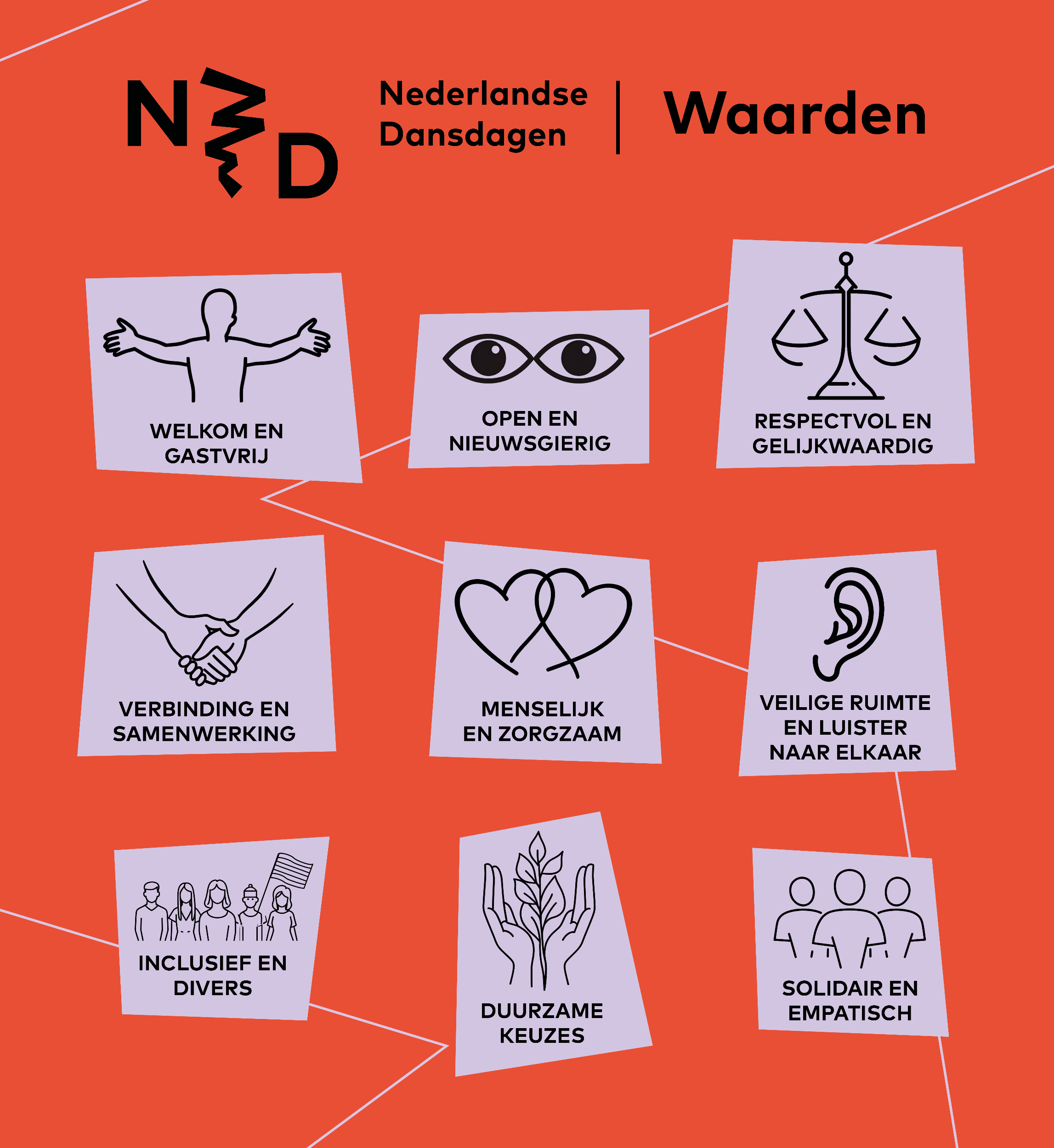 Bij de Nederlandse Dansdagen willen we samen een veilige, inclusieve en inspirerende omgeving creëren – voor ons team, artiesten, partners en publiek. Deze waarden dragen we met trots uit in onze samenwerkingen, communicatie en tijdens het festival.